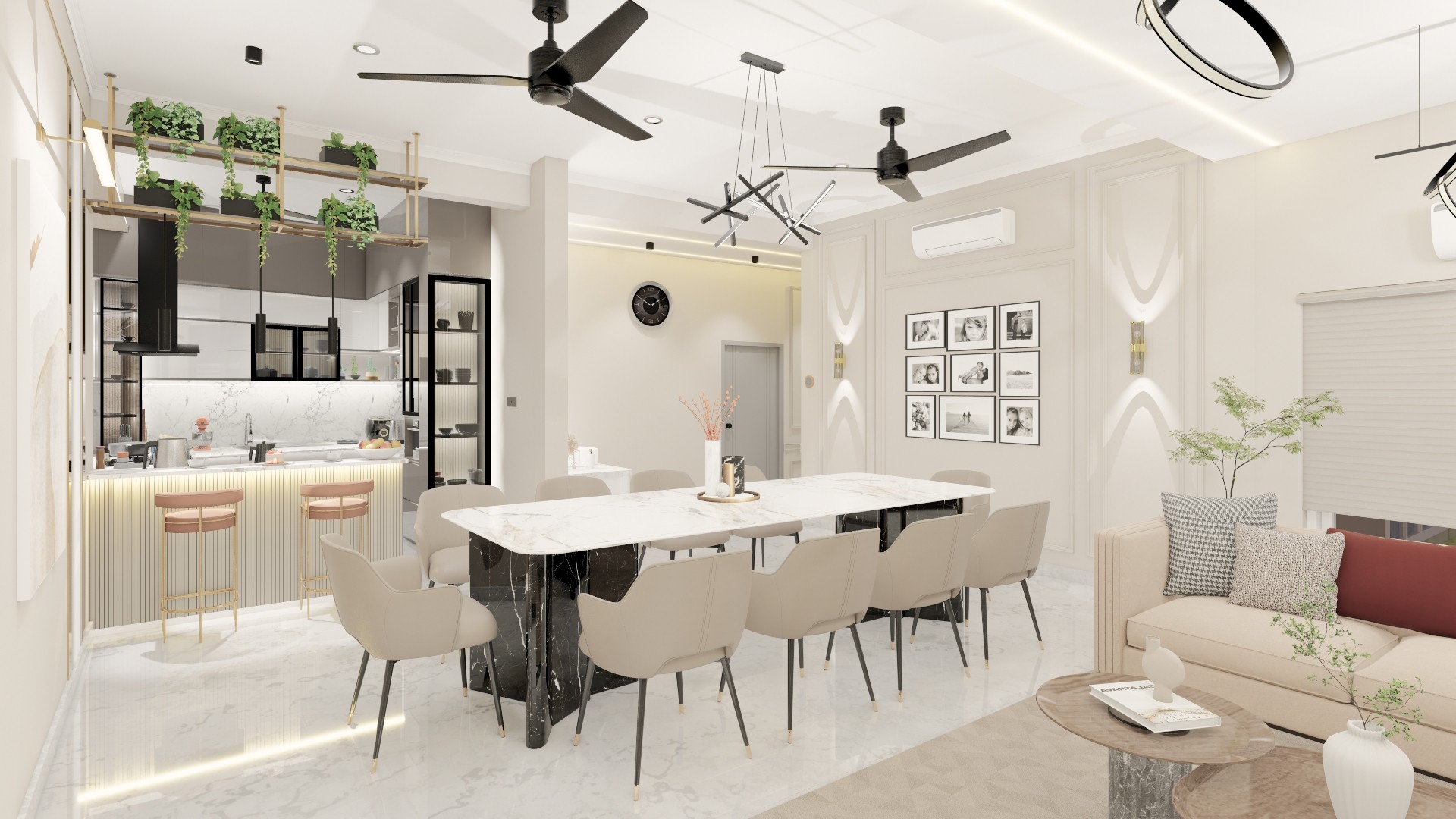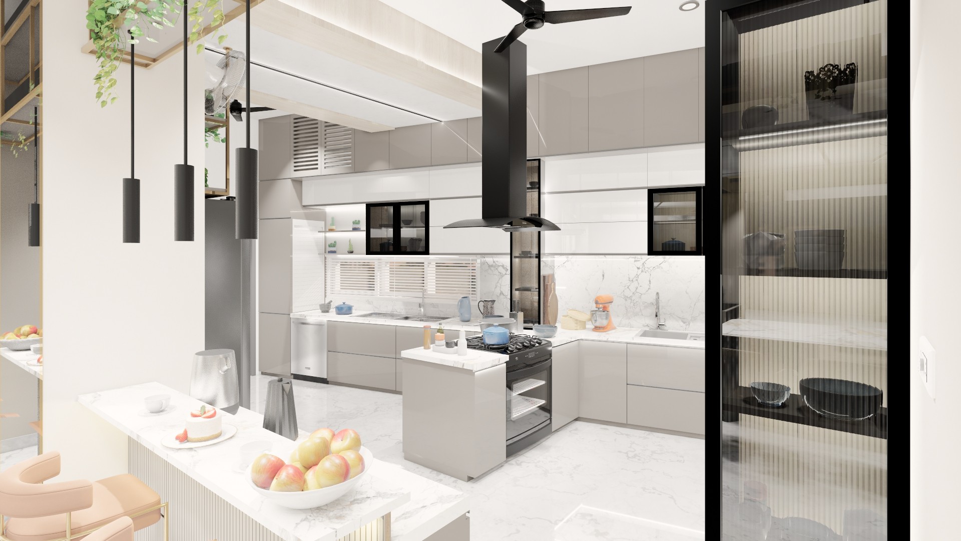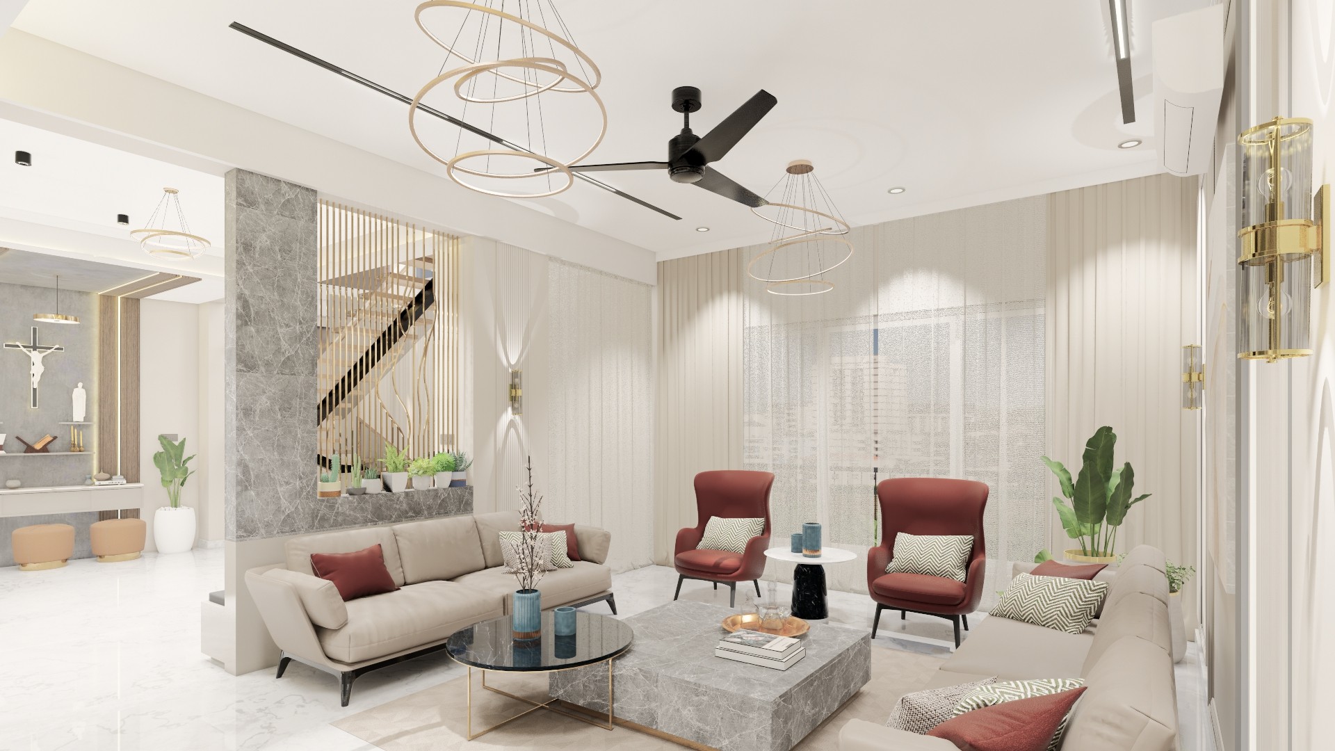Created with the vision of a clean and premium modern style home, this apartment project focus on thoughtfully placed lighting, premium wall textures, modern light fixtures and marble finishes, with the presence of common and family living spaces to accommodate plenty of social interaction. The colours in the space include a palette of cream, a combination of greys, black and a touch of burgundy used in the furniture for contrast.