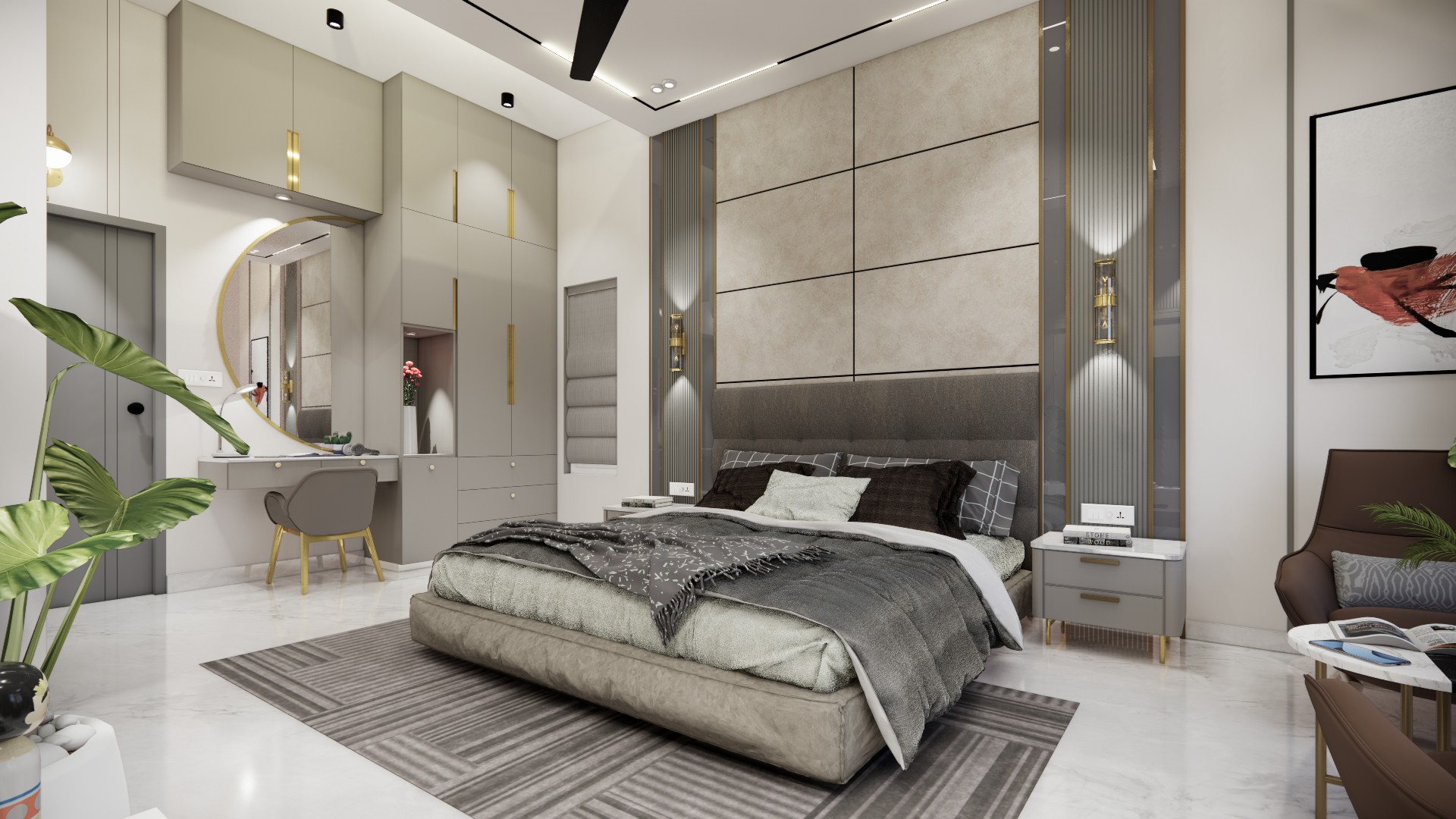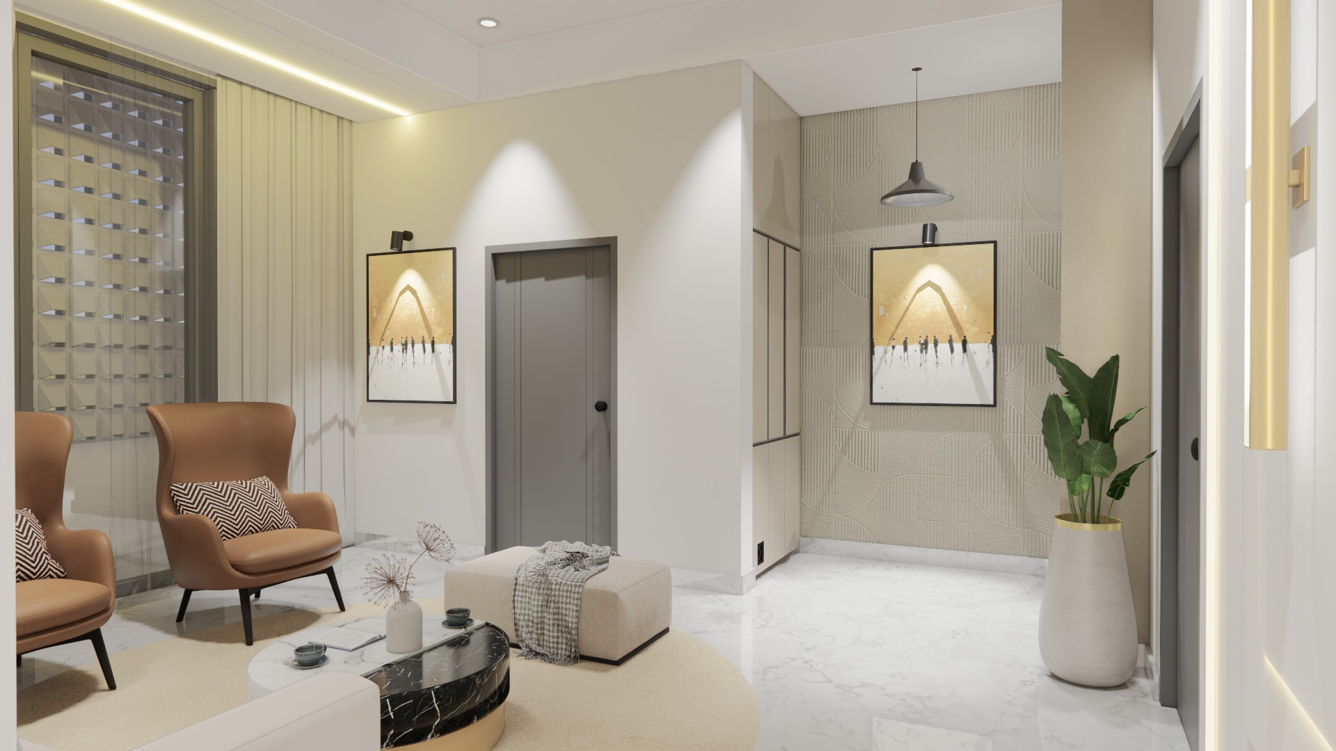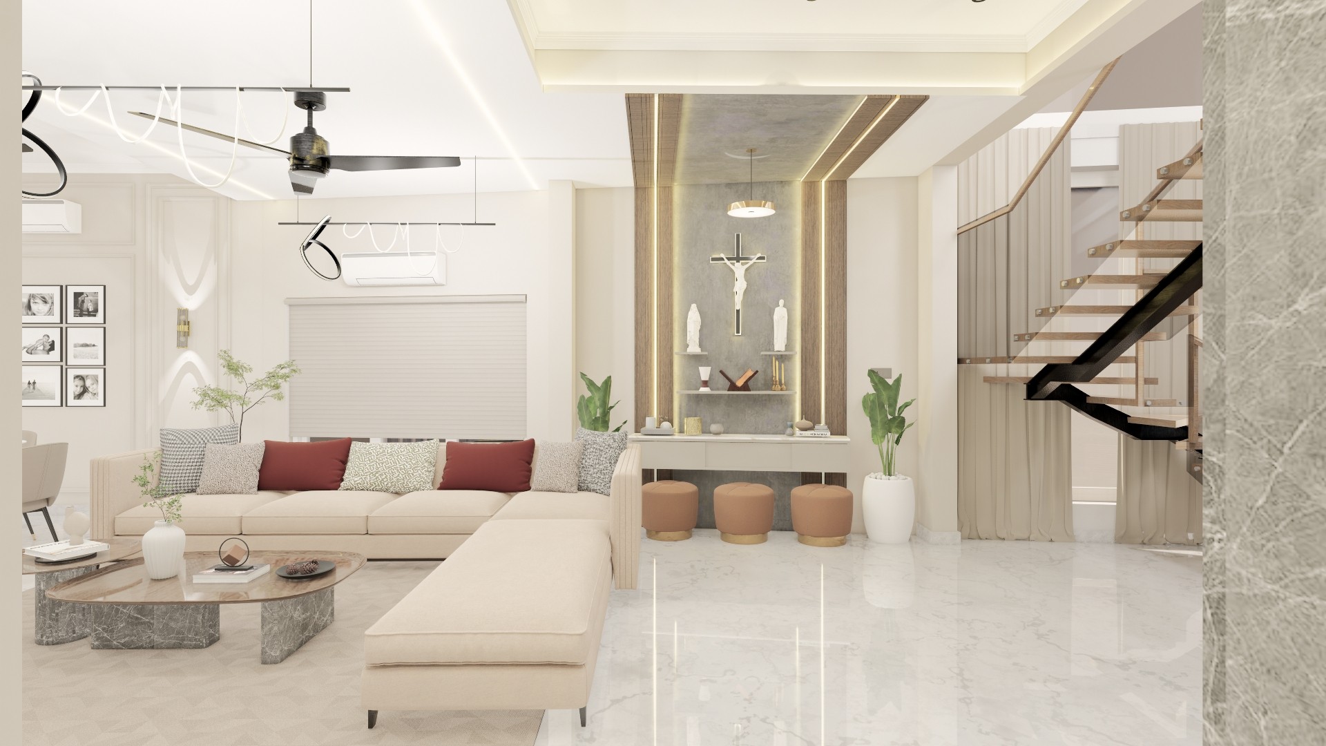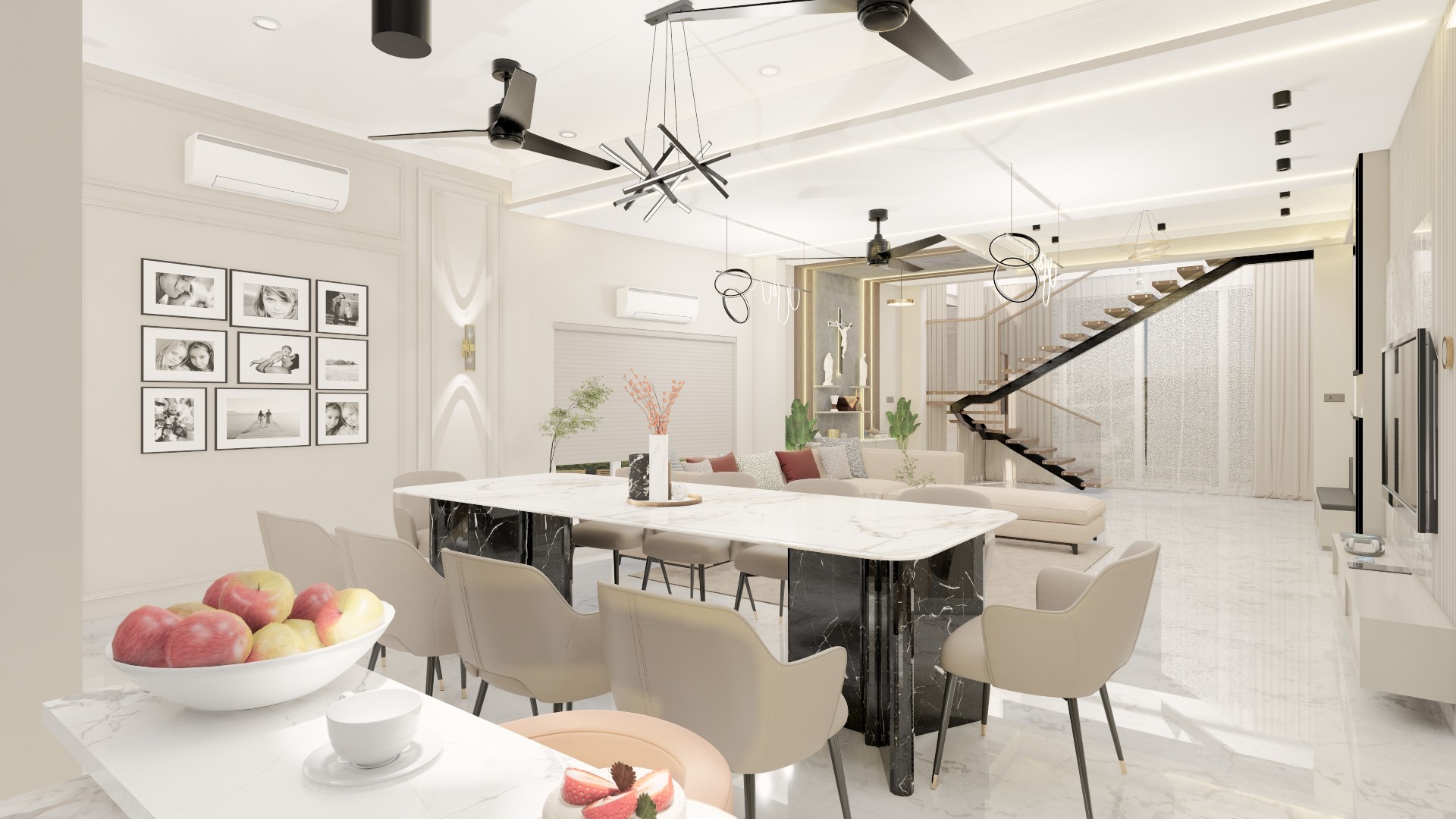 Created with the vision of a clean and premium modern style home, this apartment project focus on thoughtfully placed lighting, premium wall textures, modern light fixtures and marble finishes, with the presence of common and family living spaces to accommodate plenty of social interaction. The colours in the space include a palette of cream, a combination of greys, black and a touch of burgundy used in the furniture for contrast.