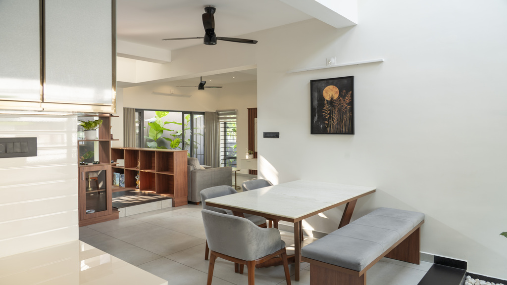 Set in the vibrant urban landscape of Kochi, this thoughtfully designed residence on just 4 cents is a perfect example of how intelligent planning can transform compact spaces into spacious, elegant homes. Designed in a minimal contemporary style, the architecture embraces clean geometry, subtle textures, and a refined material palette to create a timeless yet modern façade. Every square foot has been carefully optimized to ensure maximum functionality without compromising comfort. The layout promotes seamless movement between spaces, with an open-plan living and dining area that enhances visual continuity and allows natural light to flow freely throughout the home. Large windows and strategic ventilation points ensure bright, airy interiors while maintaining privacy within an urban setting. Smart space utilization is at the core of this design, from built-in storage solutions and multifunctional furniture zones to efficient circulation paths that eliminate wasted corners. The staircase placement, room proportions, and ceiling heights are all thoughtfully considered to create a sense of openness beyond the actual footprint. The neutral color palette, modern lighting, and minimal detailing further enhance the spacious feel, proving that contemporary design thrives on simplicity and purpose. This home stands as an inspiration for urban homeowners who believe that limited land area does not limit lifestyle quality. A perfect blend of aesthetics, efficiency, and comfort — redefining compact city living in Kochi.